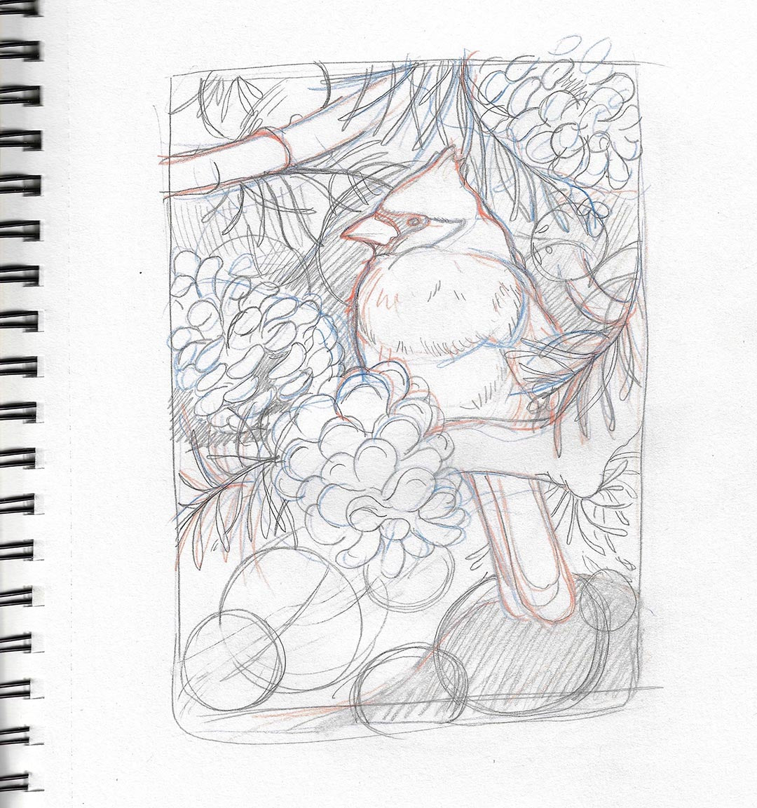 Cardinal in the Pines-Tiny Original Mixed media Art