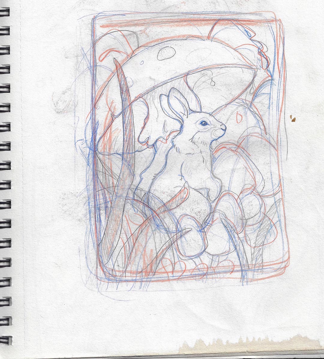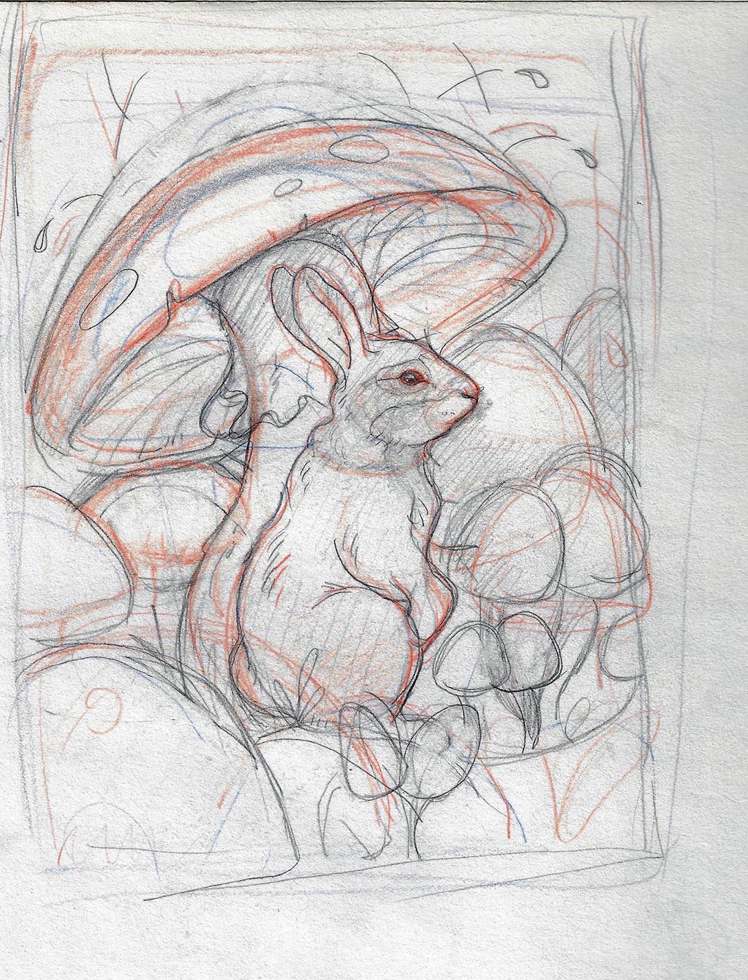 The tiny rabbit waits out a quick summer shower under the protection of a magical mushroom. I’ve included two images of my initial sketches to share a glimpse of my thought process behind the painting.