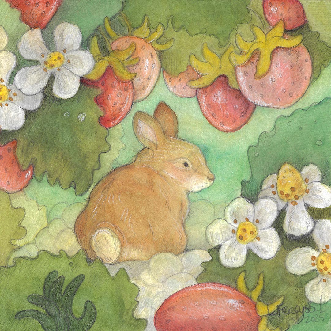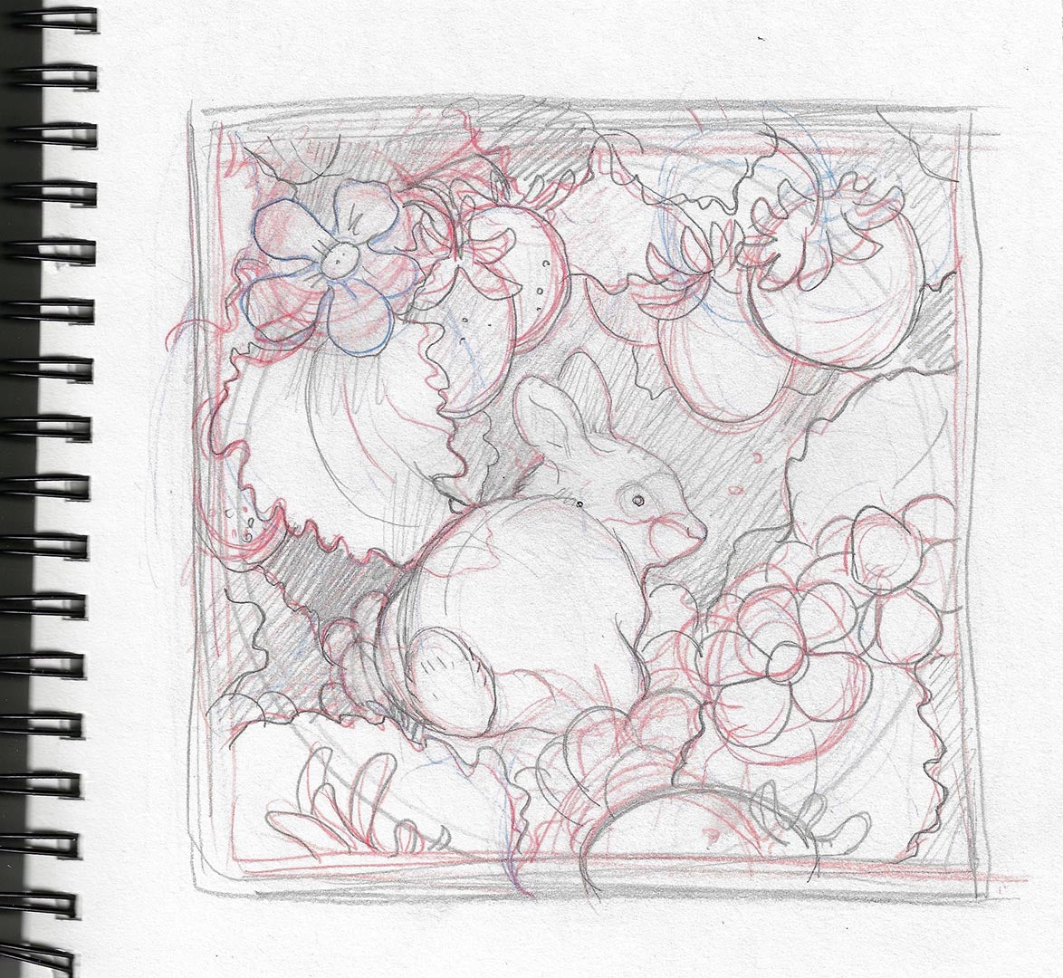 I have a thing for tiny rabbits...I don't know why. Here is a tiny rabbit in a strawberry garden.. I’ve included an image from my initial sketches to share a glimpse of my thought process behind the painting.